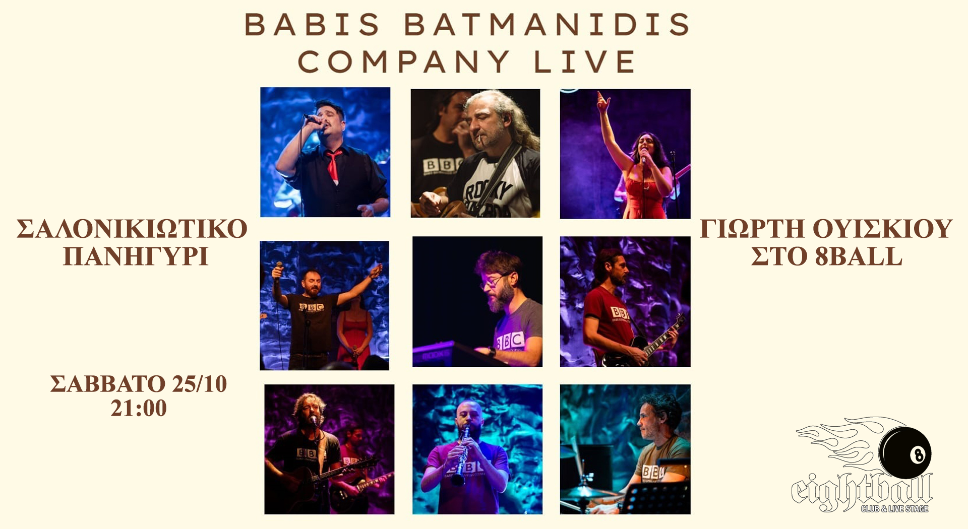 Το Σάββατο 25 Οκτωβρίου η εορτάζουσα Θεσσαλονίκη αποκτάει το δικό της πανηγύρι (όχι πως δεν το είχε τόσα χρόνια) Οι Babis Batmanidis Company έρχονται στο Eightball stage και ετοιμάζονται για ένα ακόμη μεγαλειώδες sold out στα ποτήρια. Κατά τα άλλα τα πράγματα θα ναι νορμάλ, εισιτήργια υπάρχουν !