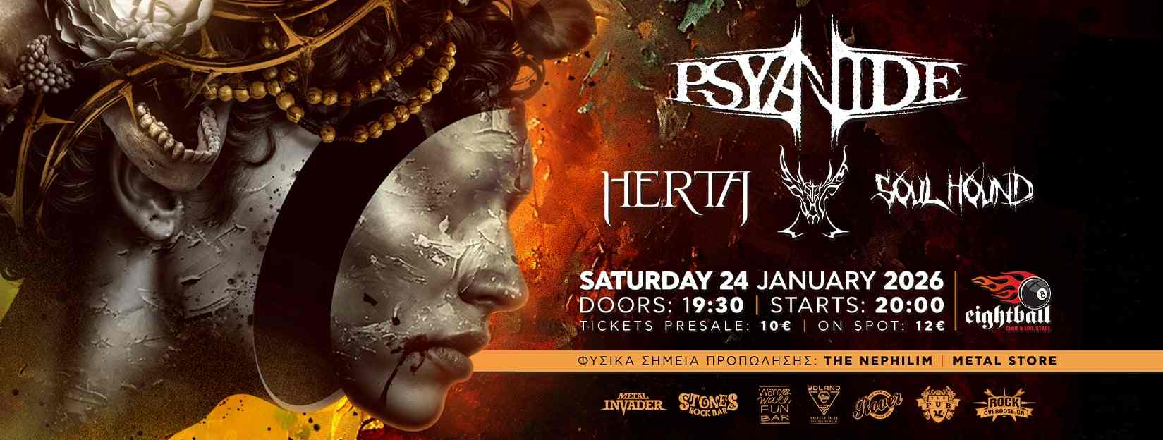 Οι Groove melodic death metallers Psyanide επιστρέφουν στην σκηνή του Eightball club το Σάββατο 24 Ιανουαρίου με σκοπό άλλο ένα εκρηκτικό headline show όπως μας έχουν συνηθίσει τα τελευταία χρόνια. Μαζί τους η νέα δύναμη του progressive groove metal της χώρα μας οι Herta απο την Αθήνα όπου θα μας παρουσιάσουν κομμάτια από τον πρώτο τους δίσκο Crossing The Illusion που κυκλοφόρησε πρόσφατα και έλαβε εξαιρετικές κριτικές,παρεα με το post-sludge τριο των Altar of the stag οπου θα παίξουν κομματια απο τον πρωτο τους δισκο Visceral Οffering, αλλα και νεο υλικο για πρωτη φορα.Την βραδιά θα ανοίξει η νεα δύναμη της harcore σκηνής στην Θεσσαλονίκη Soulhound που υπόσχονται να ανεβάσουν την θερμοκρασία από πολύ νωρίς. ΣΑΒΒΑΤΟ 24 ΙΑΝΟΥΑΡΙΟΥ || Eightball Club , Θεσσαλονίκη Ωρα προσέλευσης 19:30 Ωρα έναρξης 20:00 ΤΙΜΕΣ ΕΙΣΙΤΗΡΙΩΝ : Προπώληση : 10€. Ταμείο : 12€. Σημεία προπώλησης: The Nephilim Metal Music Store Απευθείας επικοινωνία και με τις μπάντες.